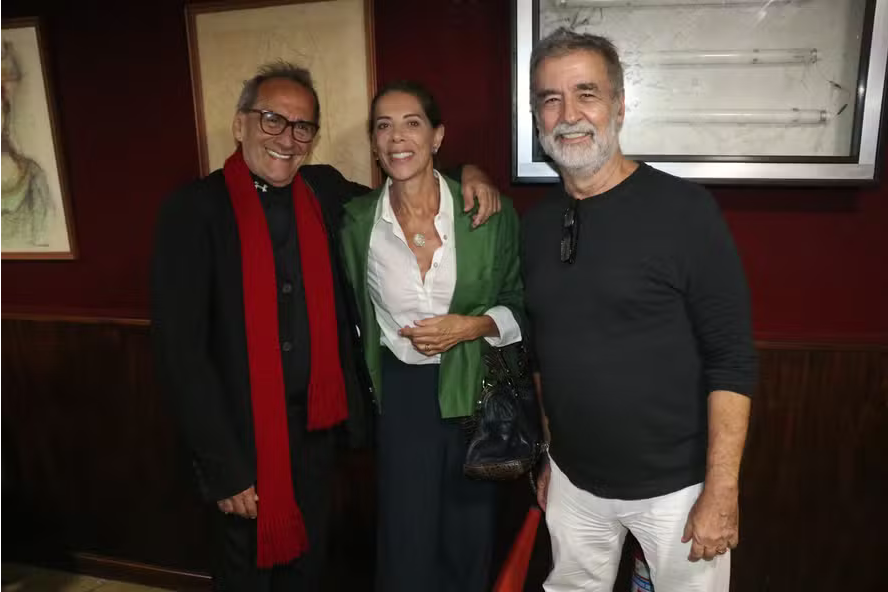 A atriz Ângela Vieira e seu marido, o cartunista Miguel Paiva, prestigiaram o amigo de longa data, o ator David Pinheiro, eternizado pelo bordão “Sambarilove”, na estreia do espetáculo “É o otimismo que faz o besouro voar!”, no Teatro Vannucci, na Gávea, Zona Sul do Rio.