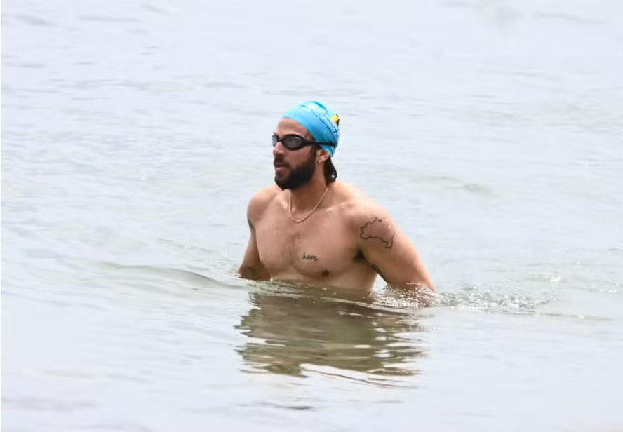Chay Suede, de 32 anos, começou esta quarta-feira (6) com um treino de natação em mar aberto. O ator aproveitou o momento de folga das gravações como um dos protagonistas de Mania de Você e foi se exercitar logo no começo da manhã na praia de Copacabana, na zona sul do Rio de Janeiro.